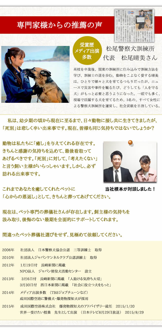 これまでに二頭のペットの最後を見送りましたが、とても親切にしていただき家族みんなで心に残るお別れをすることが出来ました。トリミング依頼されるお客様が最後までペットとの良い想い出がもてますようにと元気なうちに御社を一愛犬家として紹介しています。